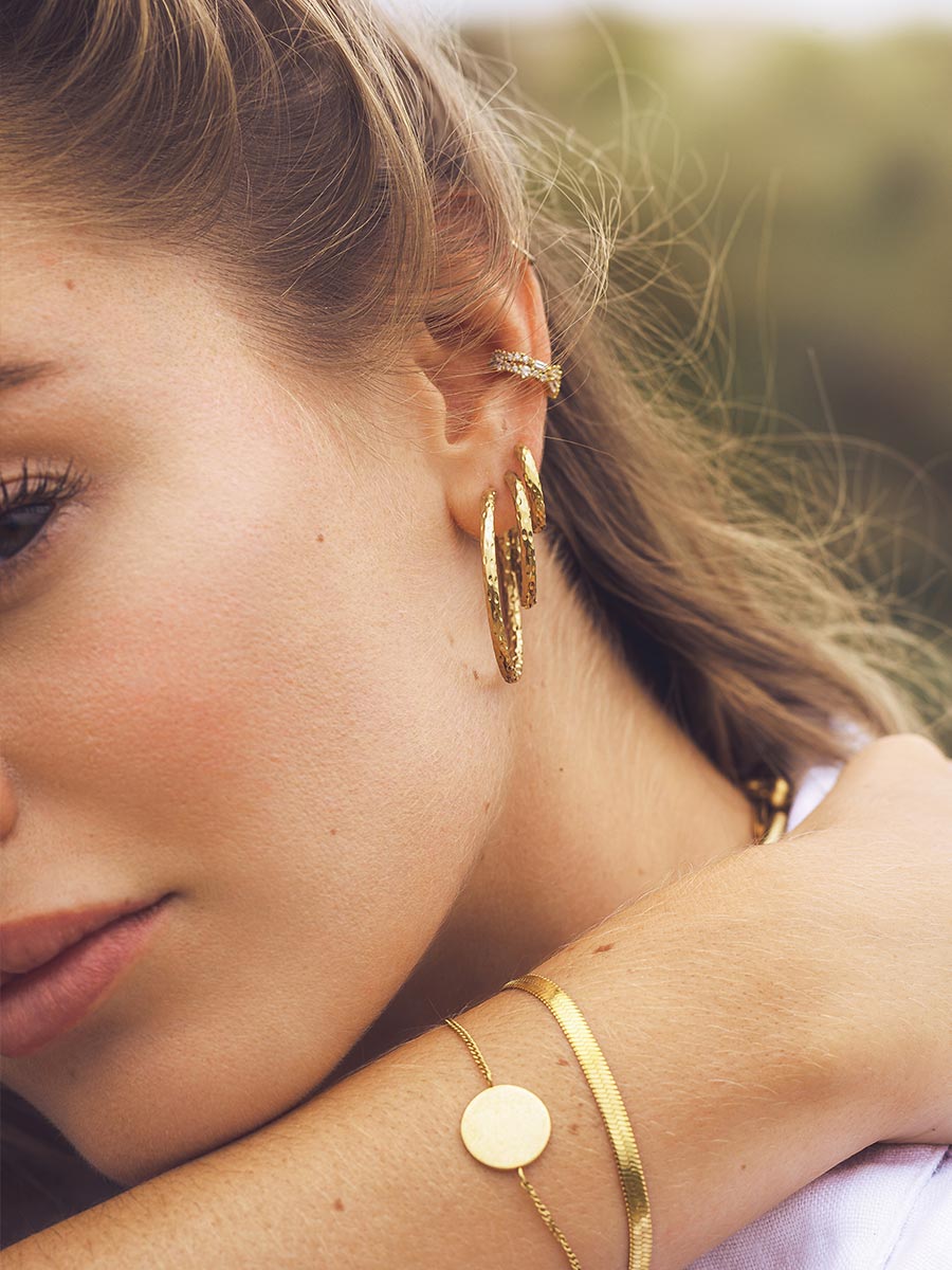 Ontdek de Textured Hoop 16mm — subtiele, gestructureerde ringen die elke outfit net iets bijzonders geven. De fijne textuur vangt licht speels, waardoor ze opvallen zonder te overweldigen.