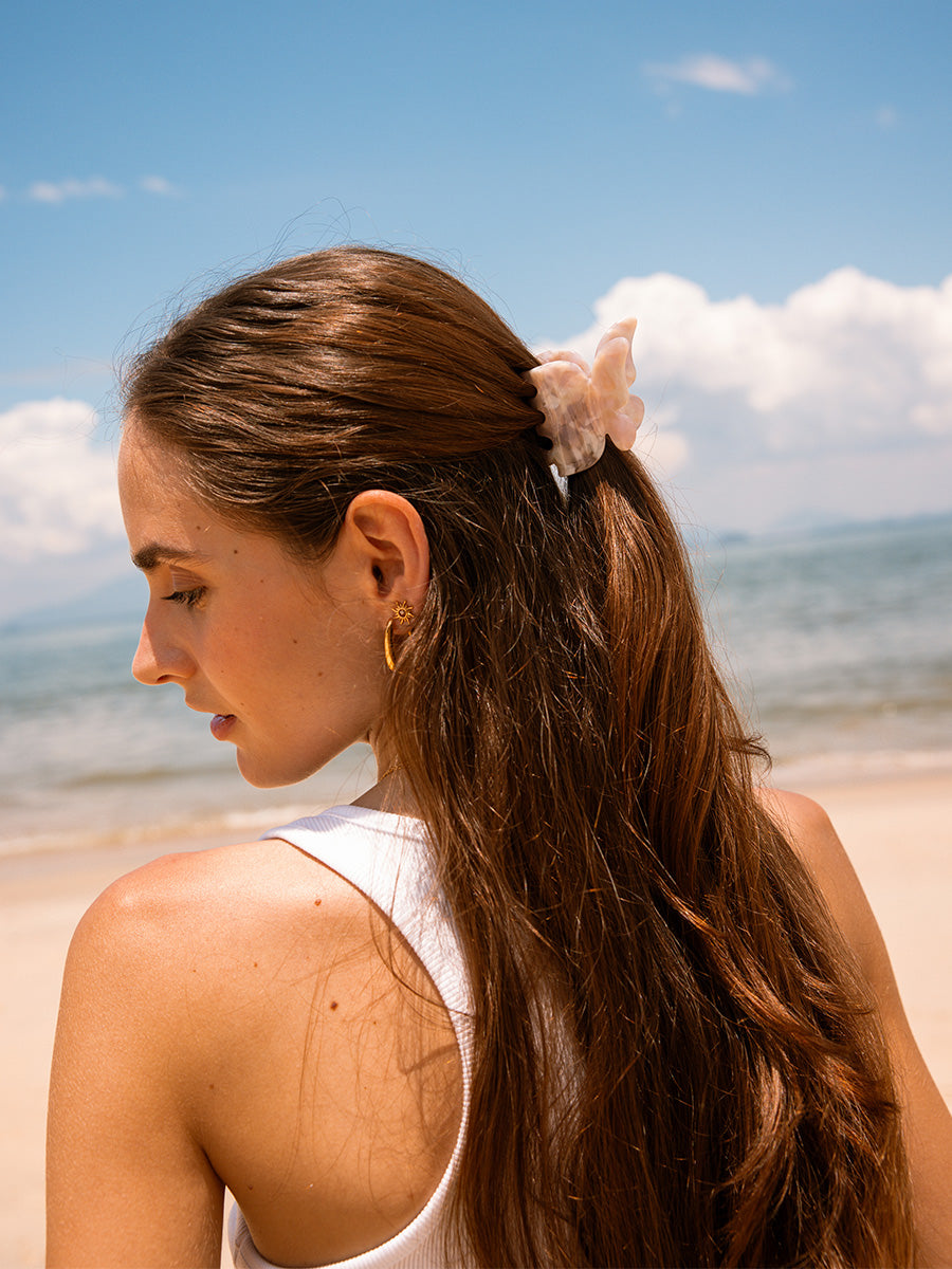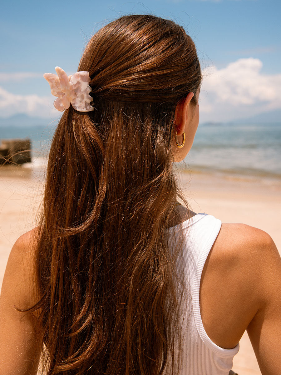 Bovendien is hij 100% waterbestendig en hypoallergeen — perfect voor de hele dag. Combineer hem met elke look: van casual dagstijl tot romantisch avondkapsel, de Vlinder Lumen Clip voegt een zachte, sprankelende touch toe.