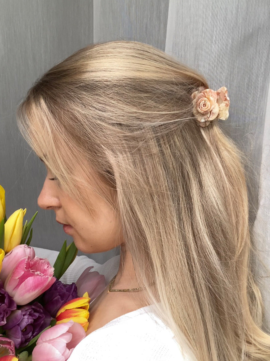 Door het subtiele bloemmotief krijgt je kapsel een zachte, romantische touch zonder overdreven te zijn. Dankzij de 8-uur durende polijsting behoudt de clip een langdurige, glanzende afwerking. Het materiaal is glad en comfortabel, dus hij zit de hele dag vast zonder te trekken of los te komen.