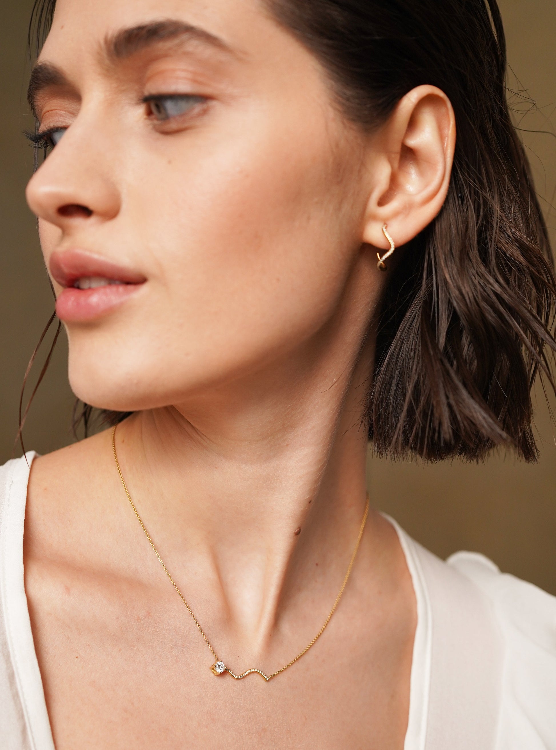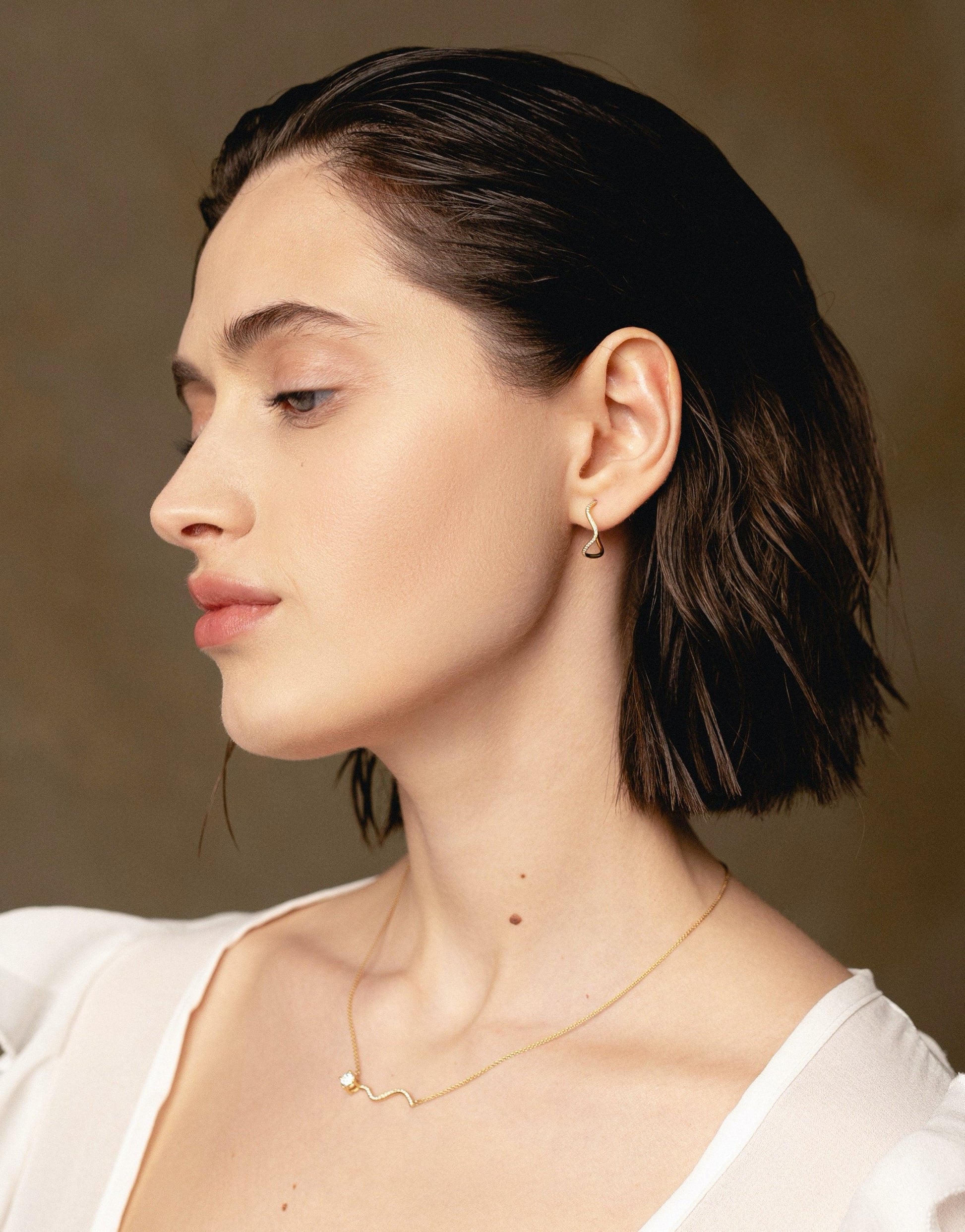 Het ontwerp is geïnspireerd op het golvende spoor van een komeet: zachte, organische lijnen die eindigen in een fonkelende diamant, als een ster die je oor siert.