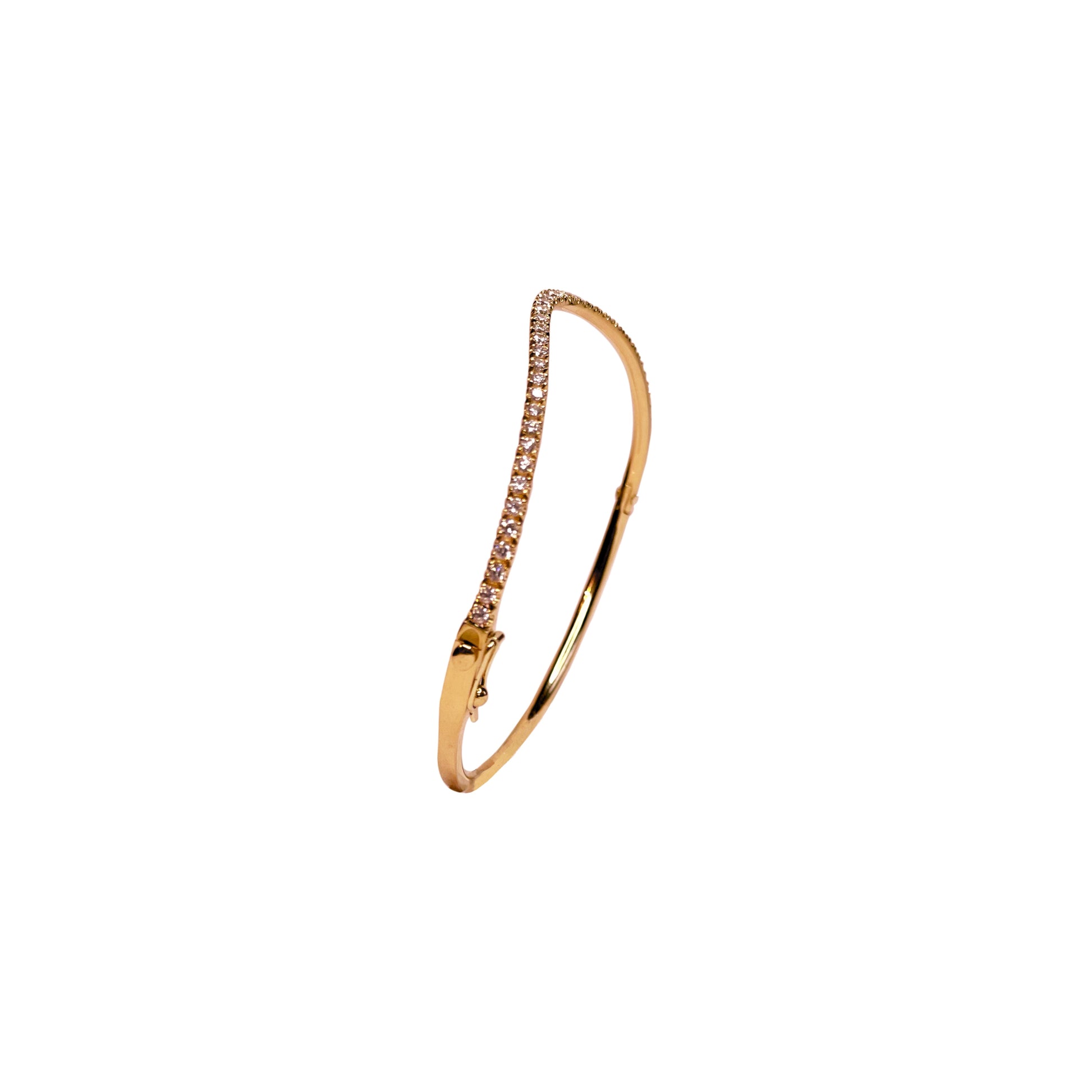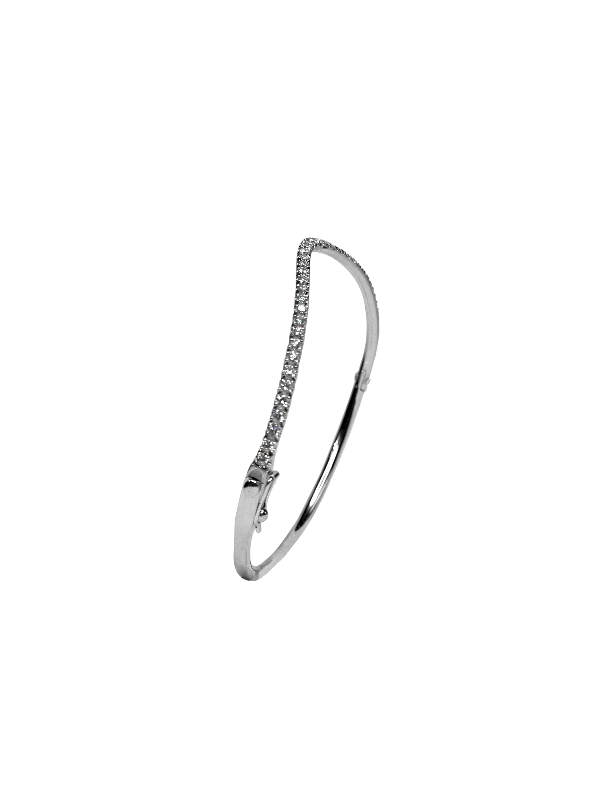 De Lumen Weave Armband is een verfijnd juweel met golvende lijnen en een subtiel pavé van fonkelende diamanten die als kleine sterretjes rond je pols dansen. Het elegante ontwerp sluit zacht aan op de huid, waardoor het lijkt alsof het licht zelf een spoor achterlaat.
