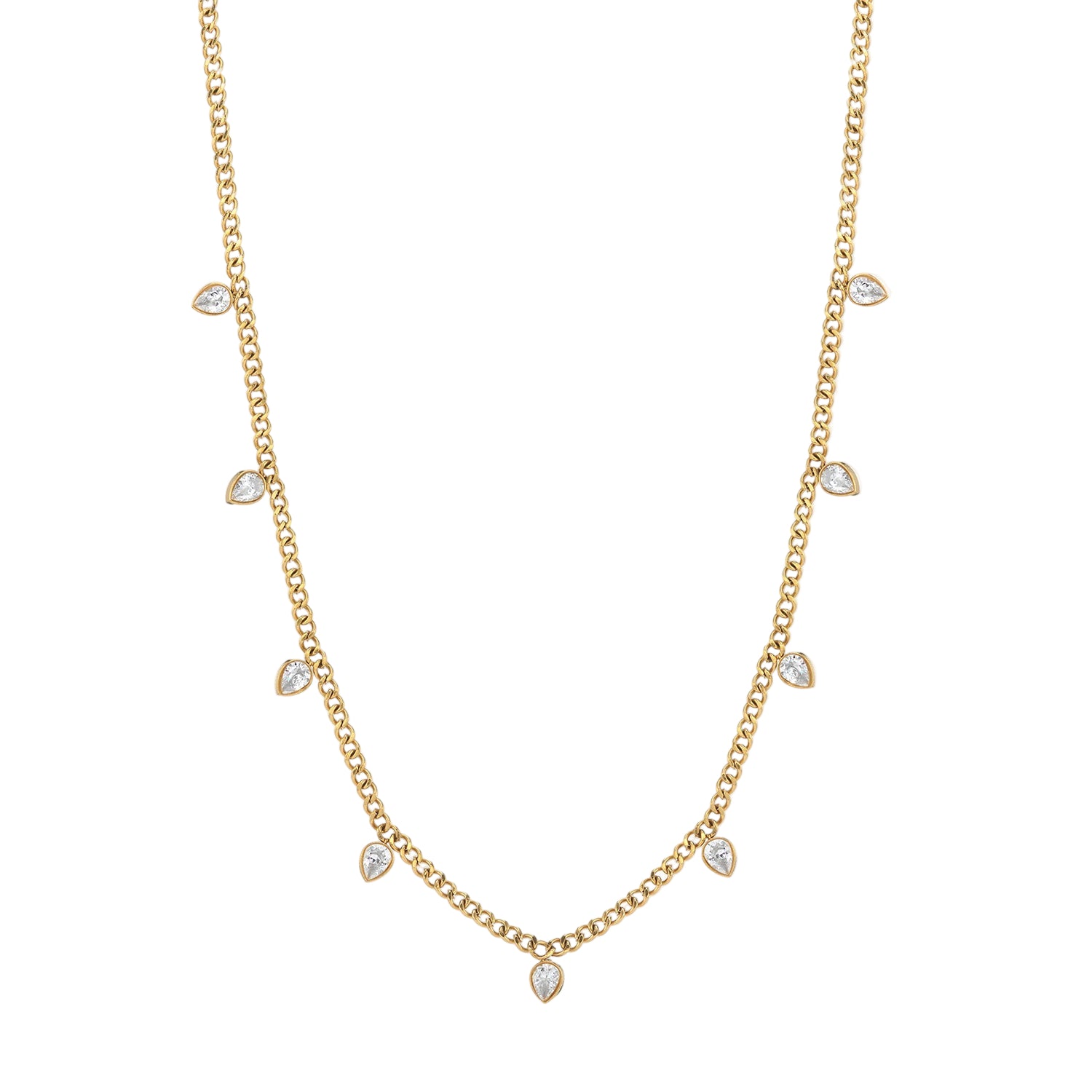 Ontdek de Sorelle Ketting — een fijne, verstelbare ketting (37-47 cm) met hand-geslepen druppelvormige 5A zirkonia’s die zacht glinsteren bij elke beweging. Gemaakt van 18 k verguld roestvrij staal dat water-, zweet- en verkleuringsbestendig is.
