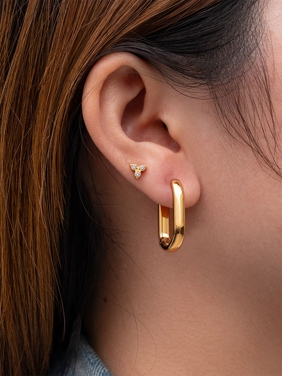 Ontdek de U-Appeal Hoops — subtiele creolen met een elegante U-vorm die zacht om je oor contouren en van elke hoek een glimlach vangen. Gemaakt van roestvrij staal met een 18 k vergulde afwerking en verkrijgbaar in goud, zilver en roségoud. De creolen meten ongeveer 23,5 x 14,8 mm met een breedte van 3,9 mm.